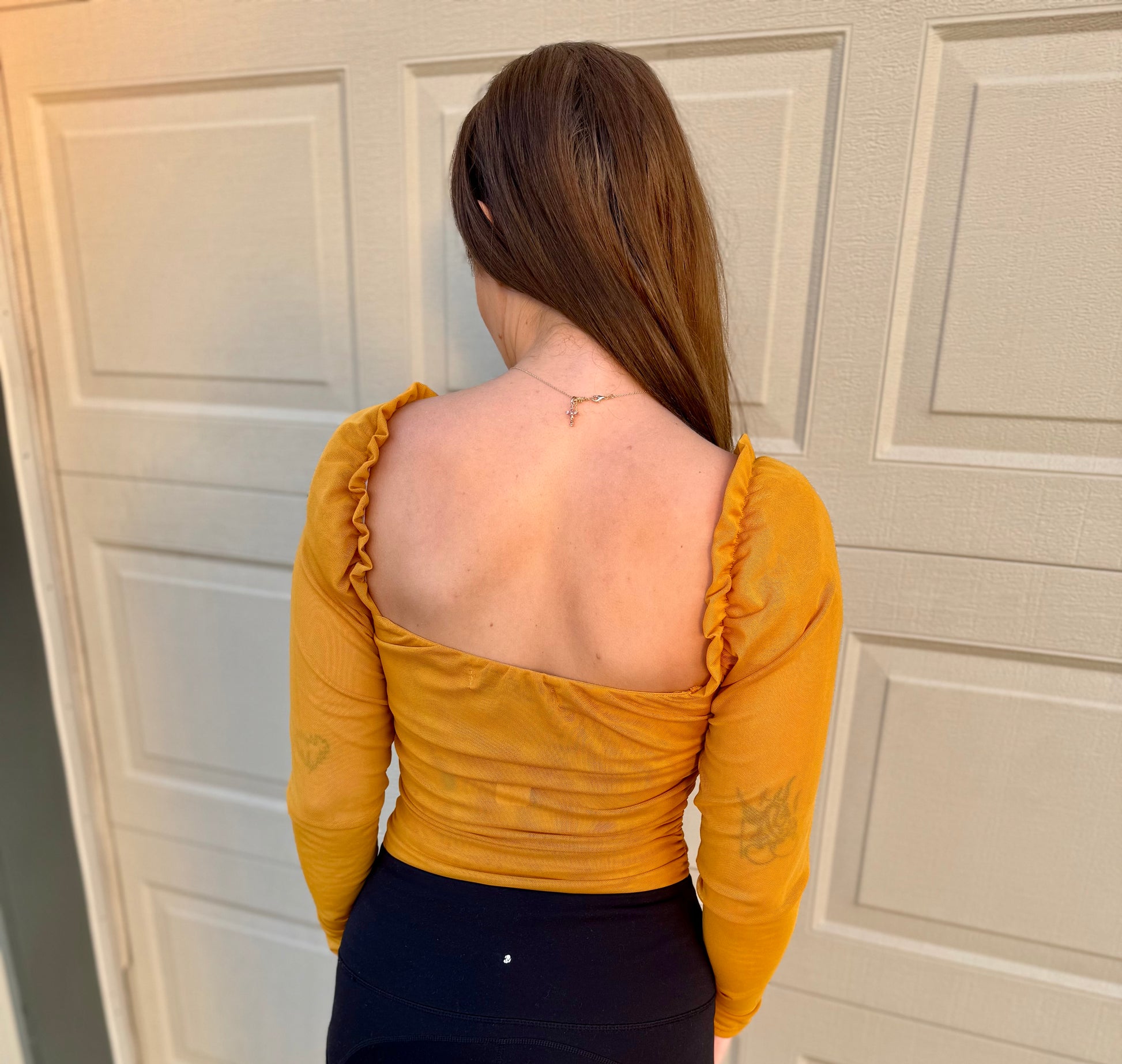 •Semi sheer double mesh body with sheer single mesh sleeves