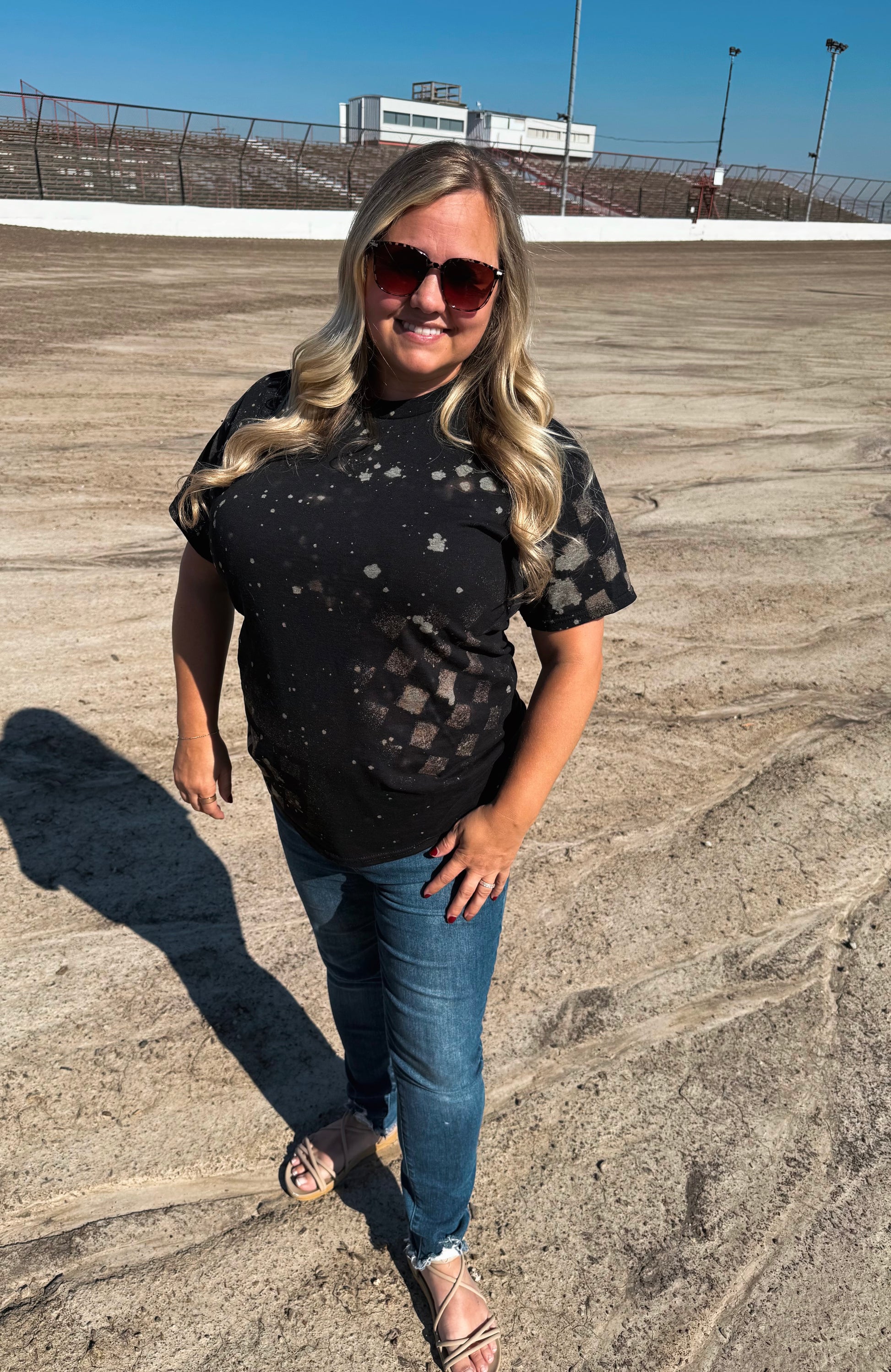 This is a hand bleached tshirt with a pop of checker added to make it unique & perfect for the dirt track
