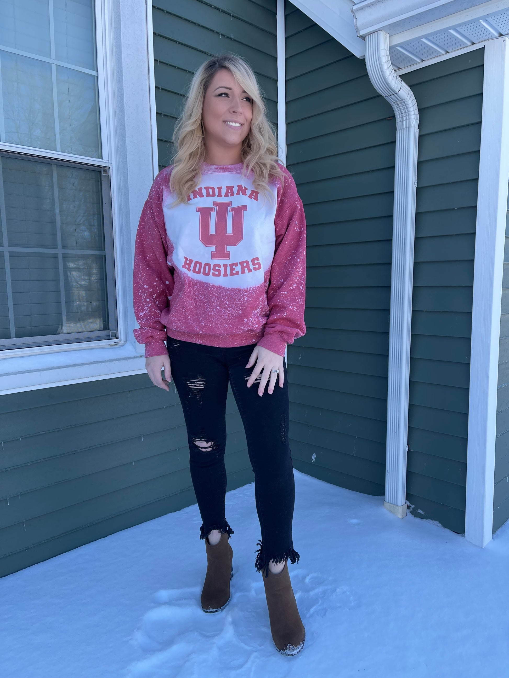 Hand bleached crewneck with Indiana design. These are a unisex fit.