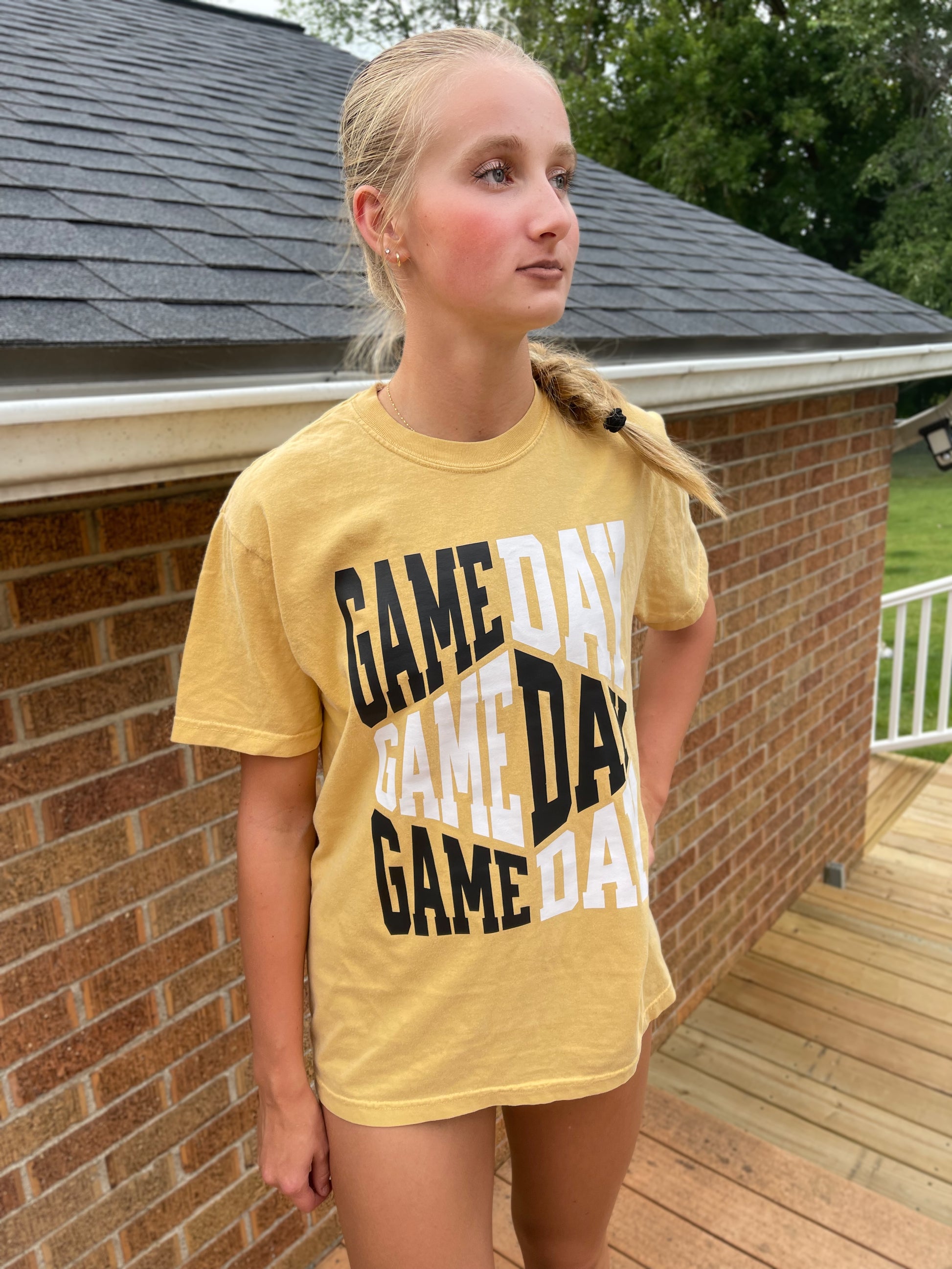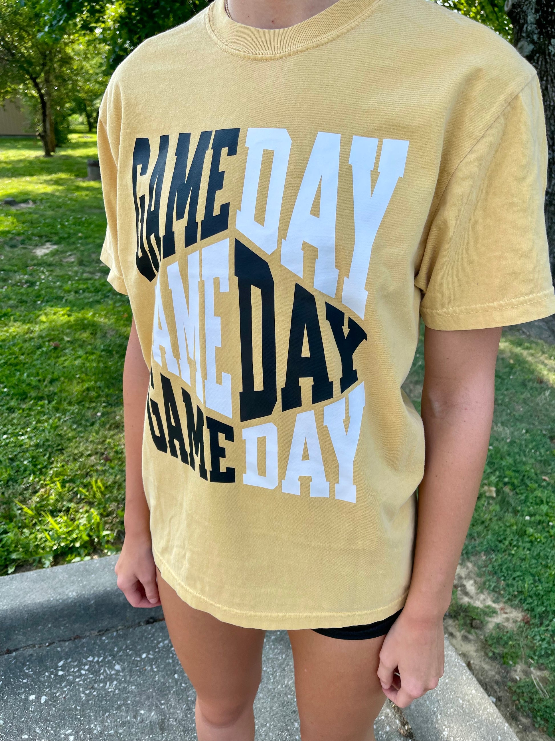 Black/white gameday printed on gold comfort colors T-shirt