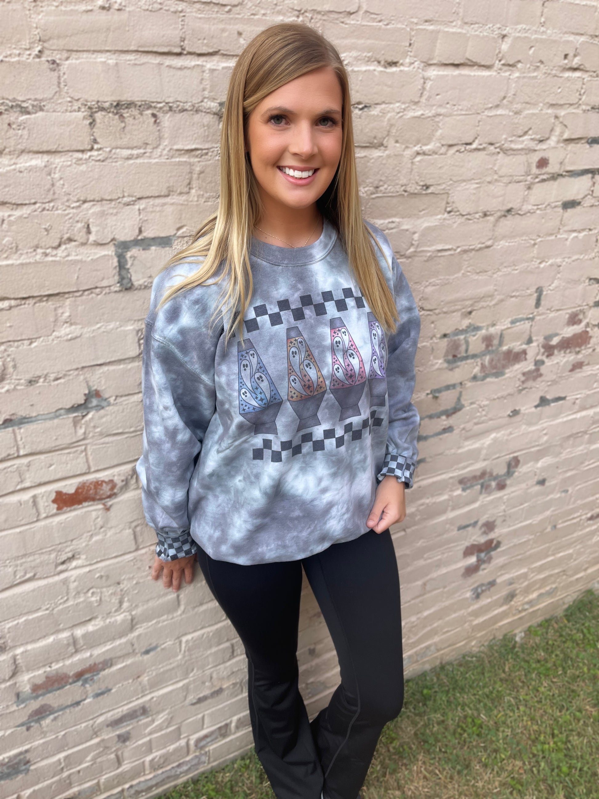 Hand dyed crewneck with groovy Halloween print and checkered cuffs