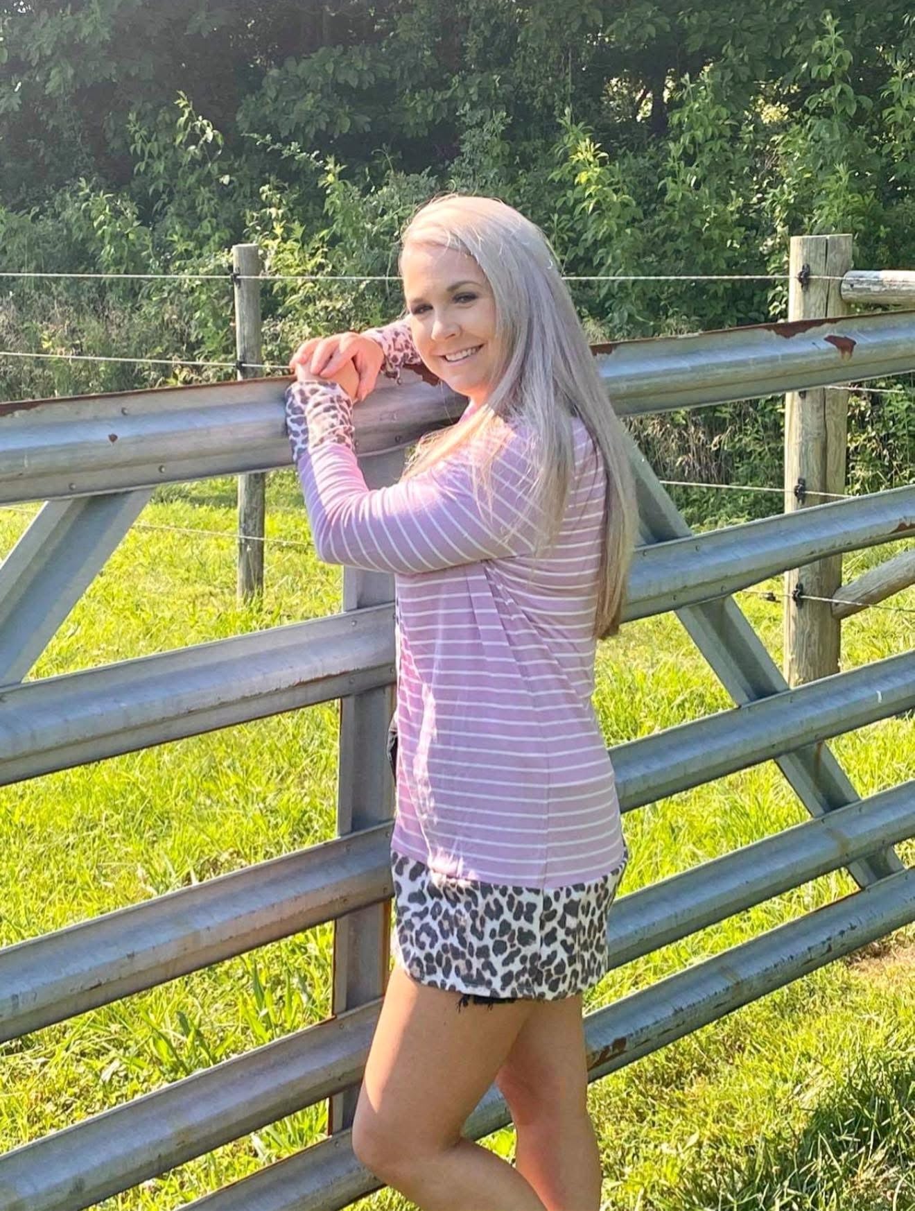 This is a lightweight cardigan with lavender coloring & white stripes.