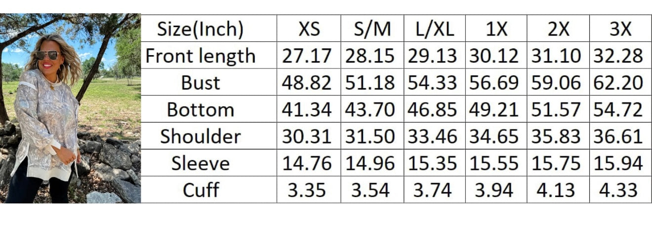 We spared no attention to detail in our sweatshirt! This forever timeless pullover is a slouchy, relaxed fit with exposed seaming, cute split cuff hem and ribbed trim detail! Has super soft "sweatshirt" feel on the inside! Now in a camo print!!