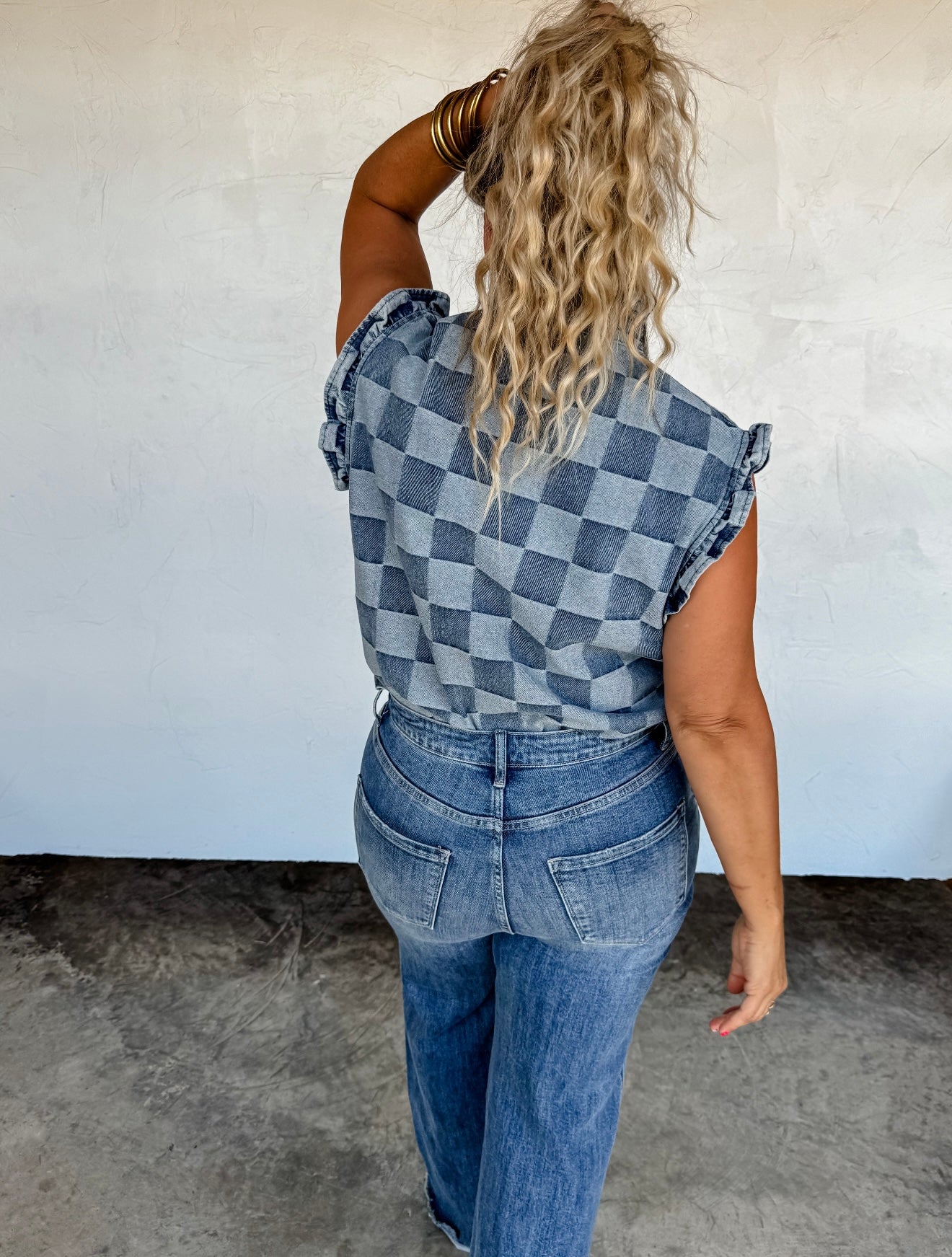 This sleeveless denim vest is the ultimate statement piece! Featuring a bold checker pattern, ruffle sleeves, and full button-up front. No stretch