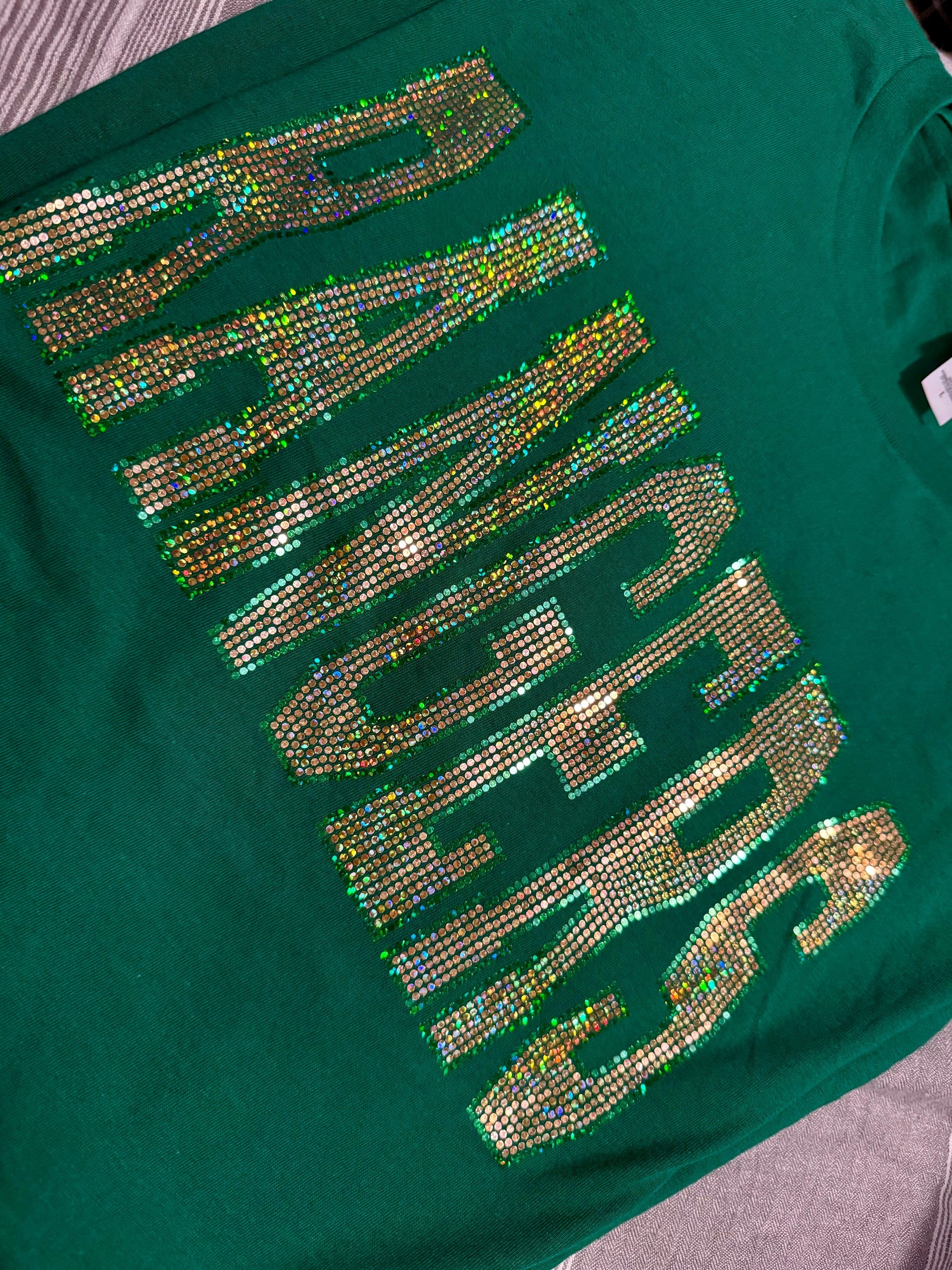 Gold sparkle wording, Rangers" printed on Bella canvas tshirts