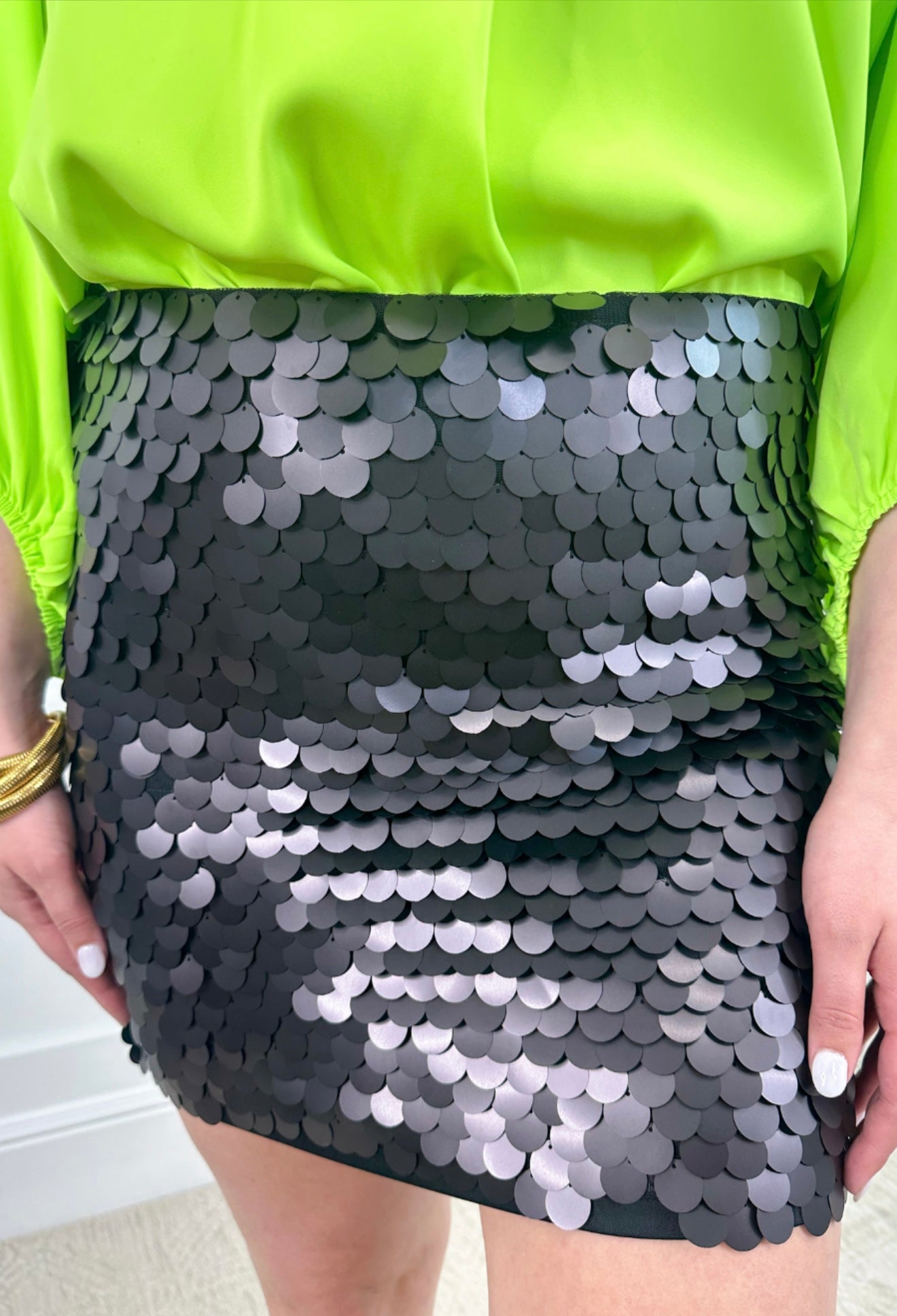 Get ready to shimmer in this sequin skirt! Made with matte disk sequins, it's fully lined for comfort and features a convenient zipper. Perfect for adding some sparkle to any outfit.